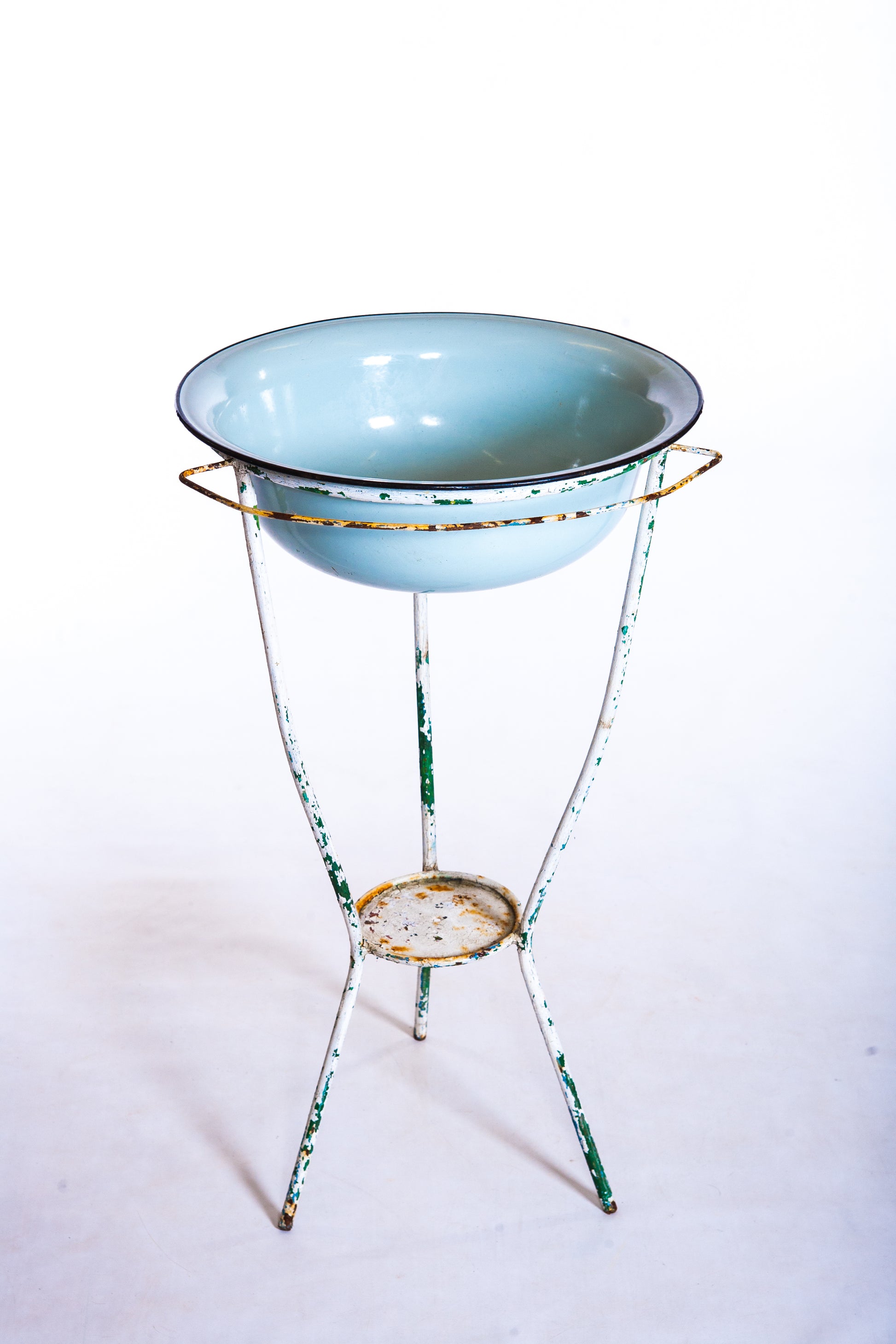 Experience the charm of a bygone era with this vintage-inspired piece with an enamel bowl. Chipped paint but looks great in any room. For plants, drinks or whatever you want.