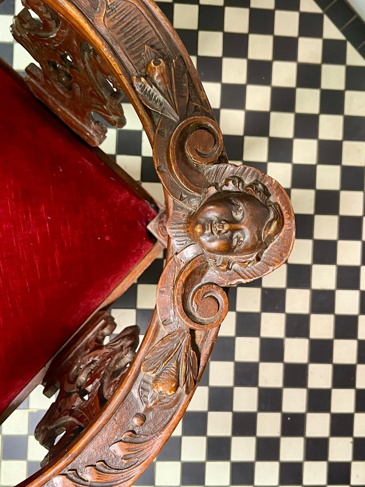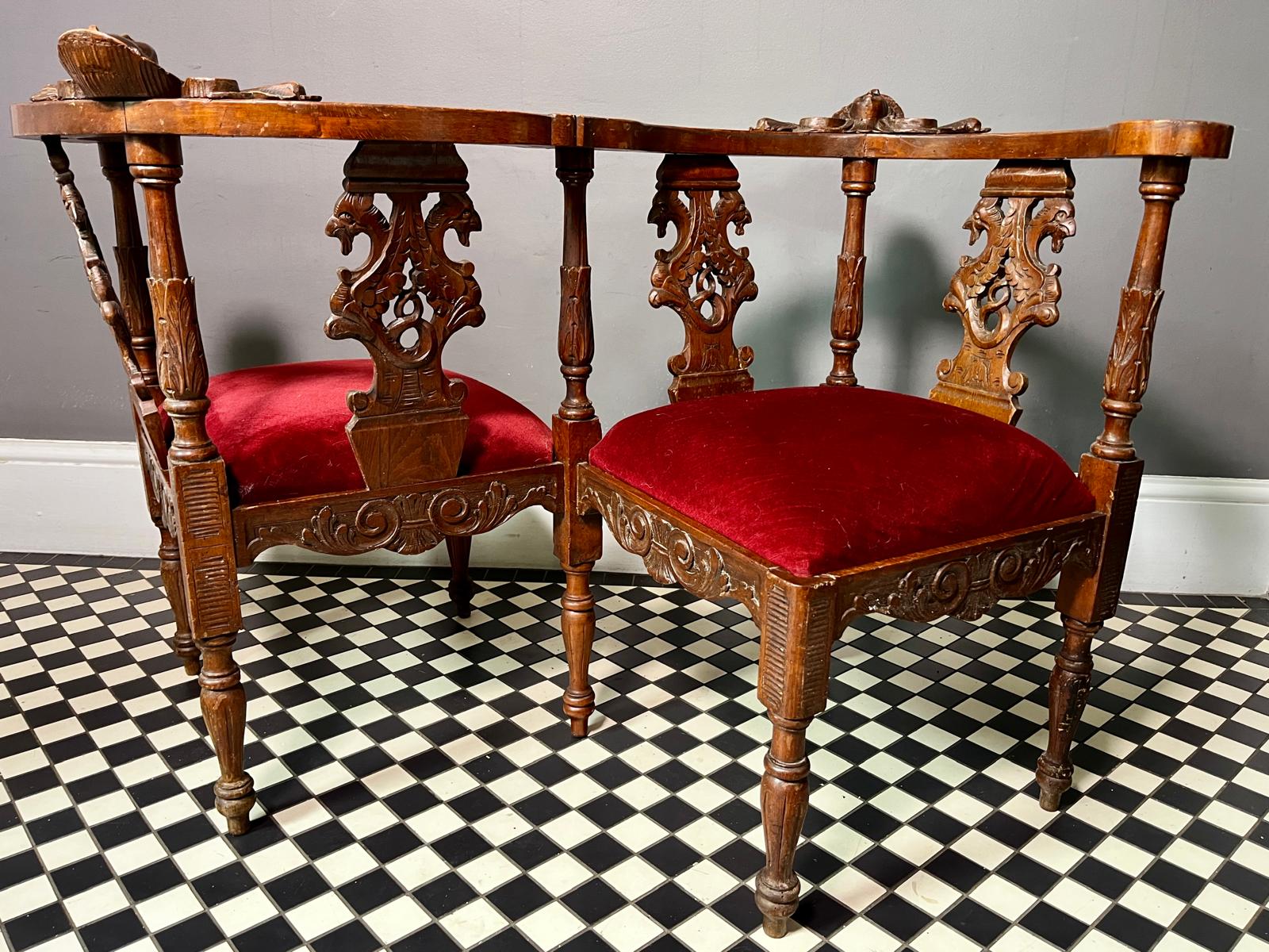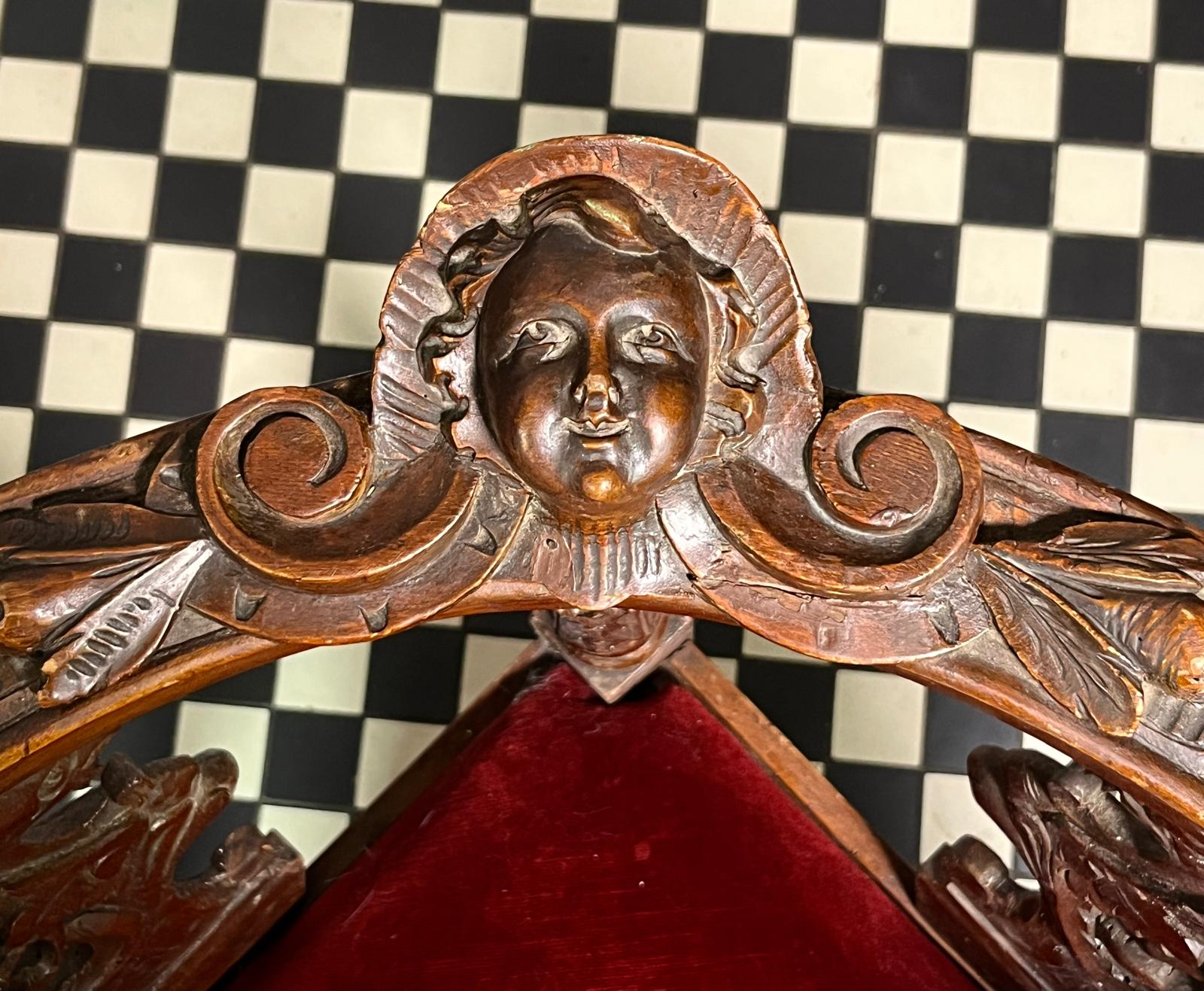 A beautiful Renaissance Style 'Tete-a-tete' or Conversation Chair. Intricate angels carved face on the backrest. Solid wood frame with nicely Italian carved details.