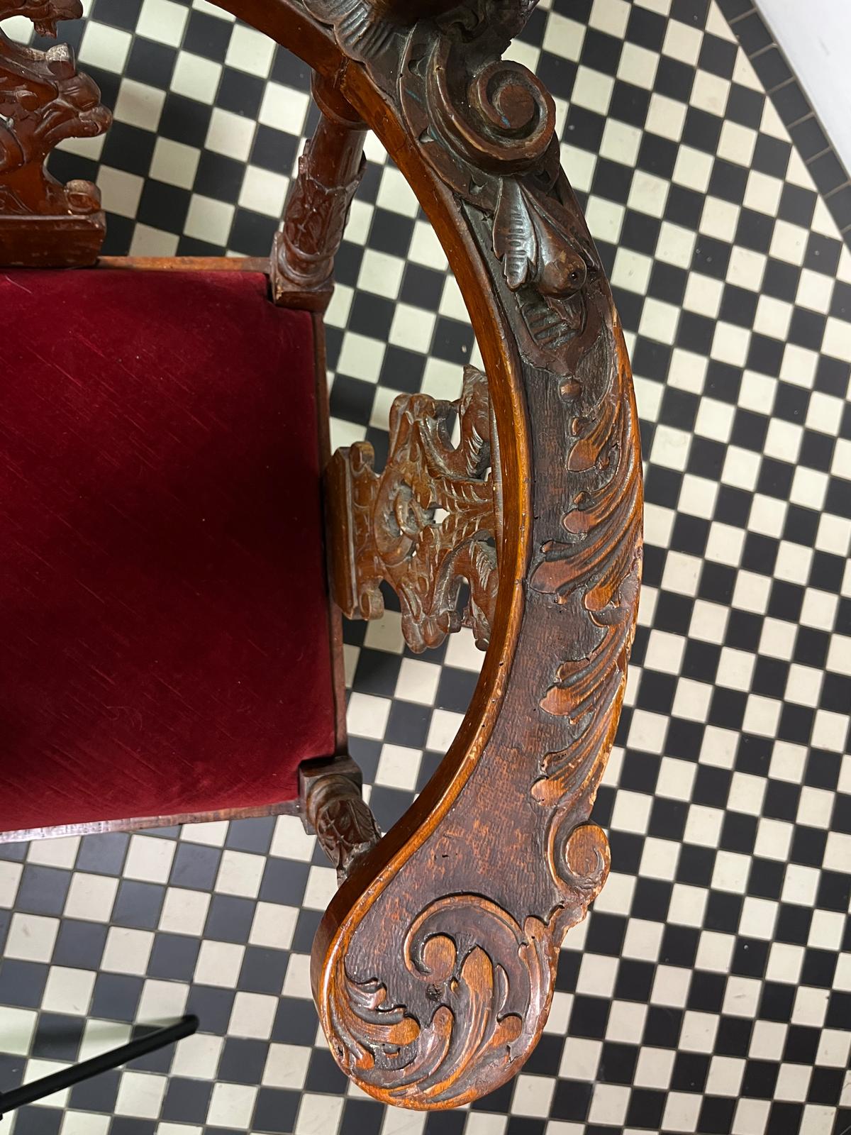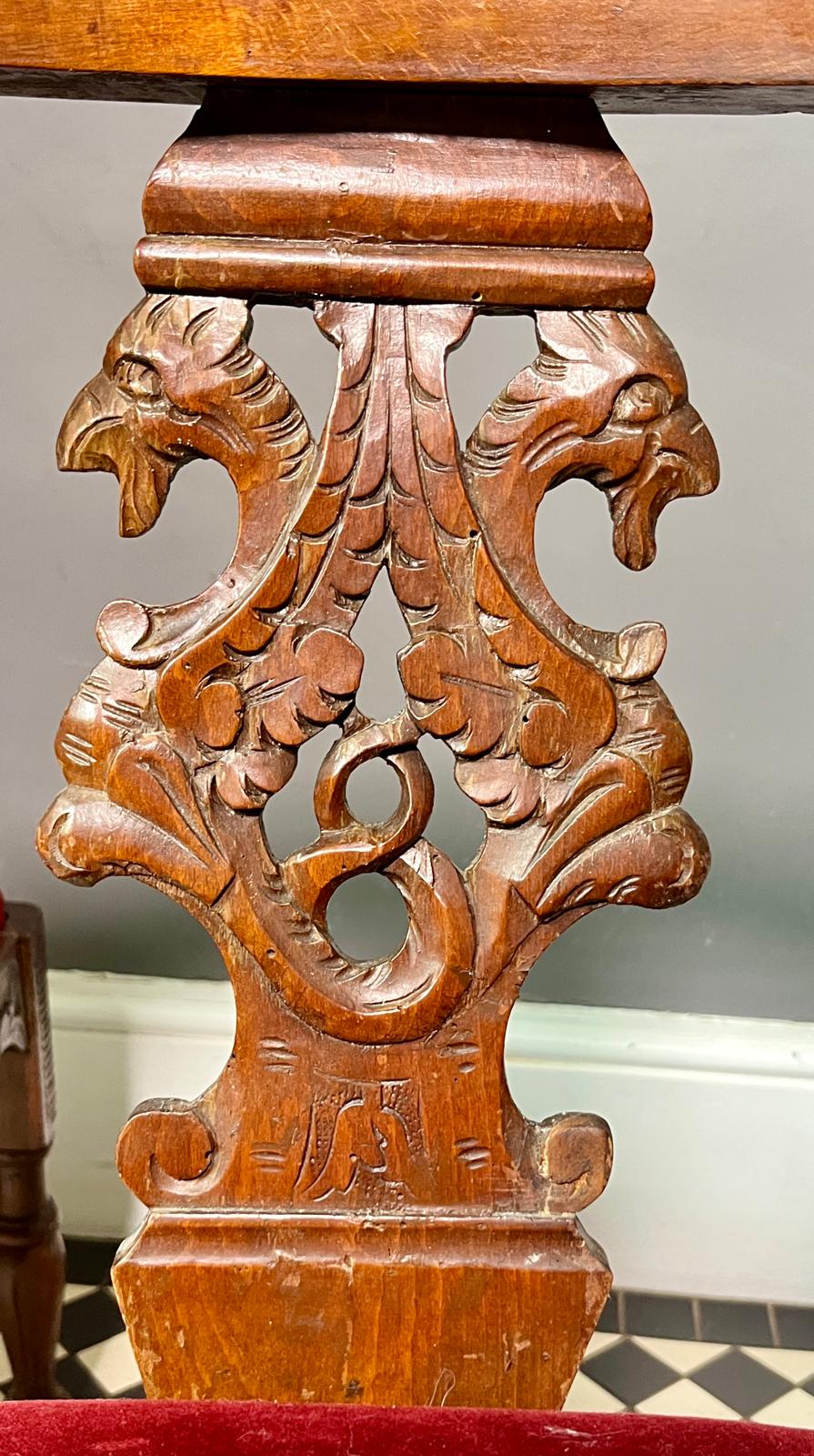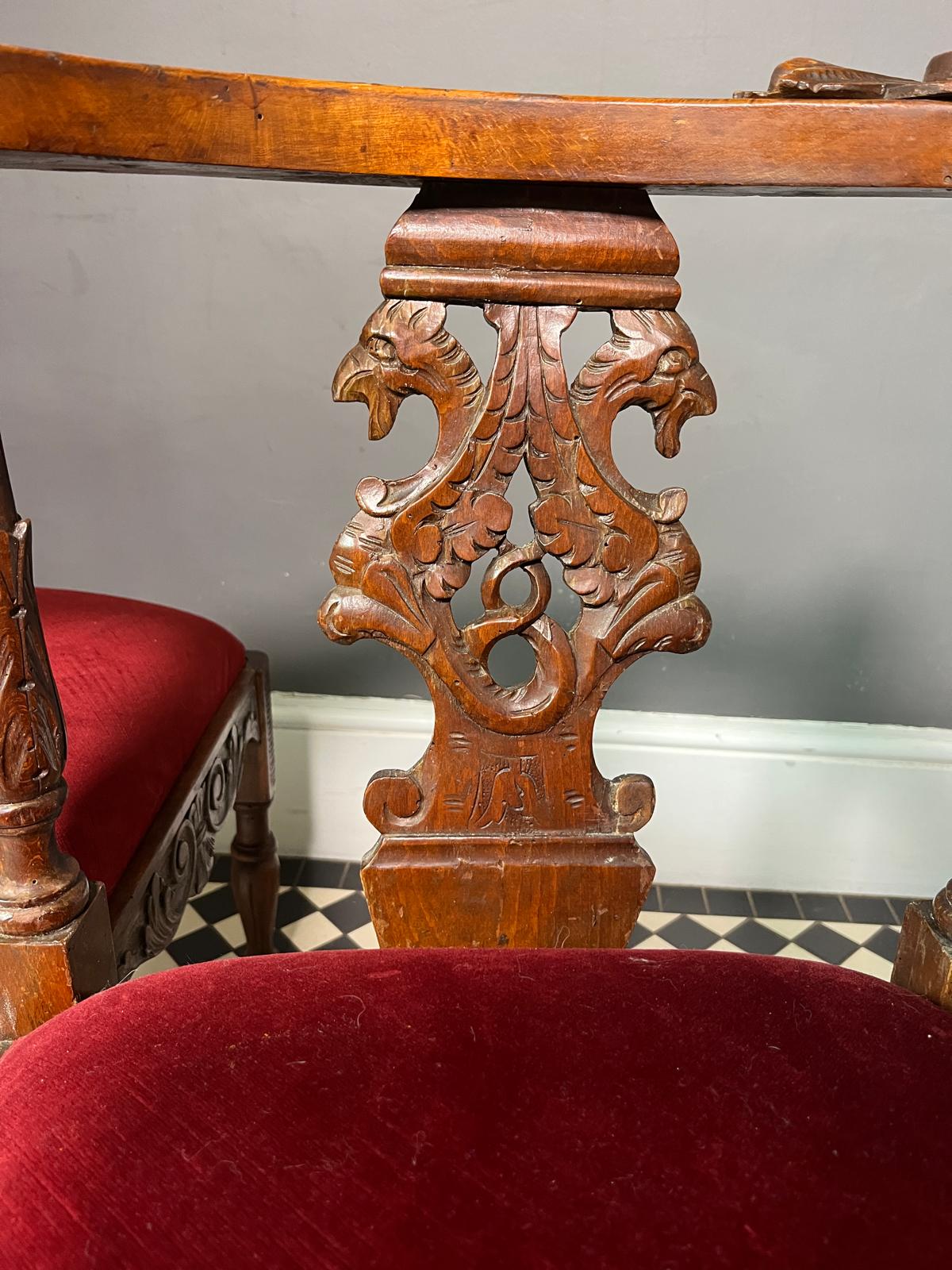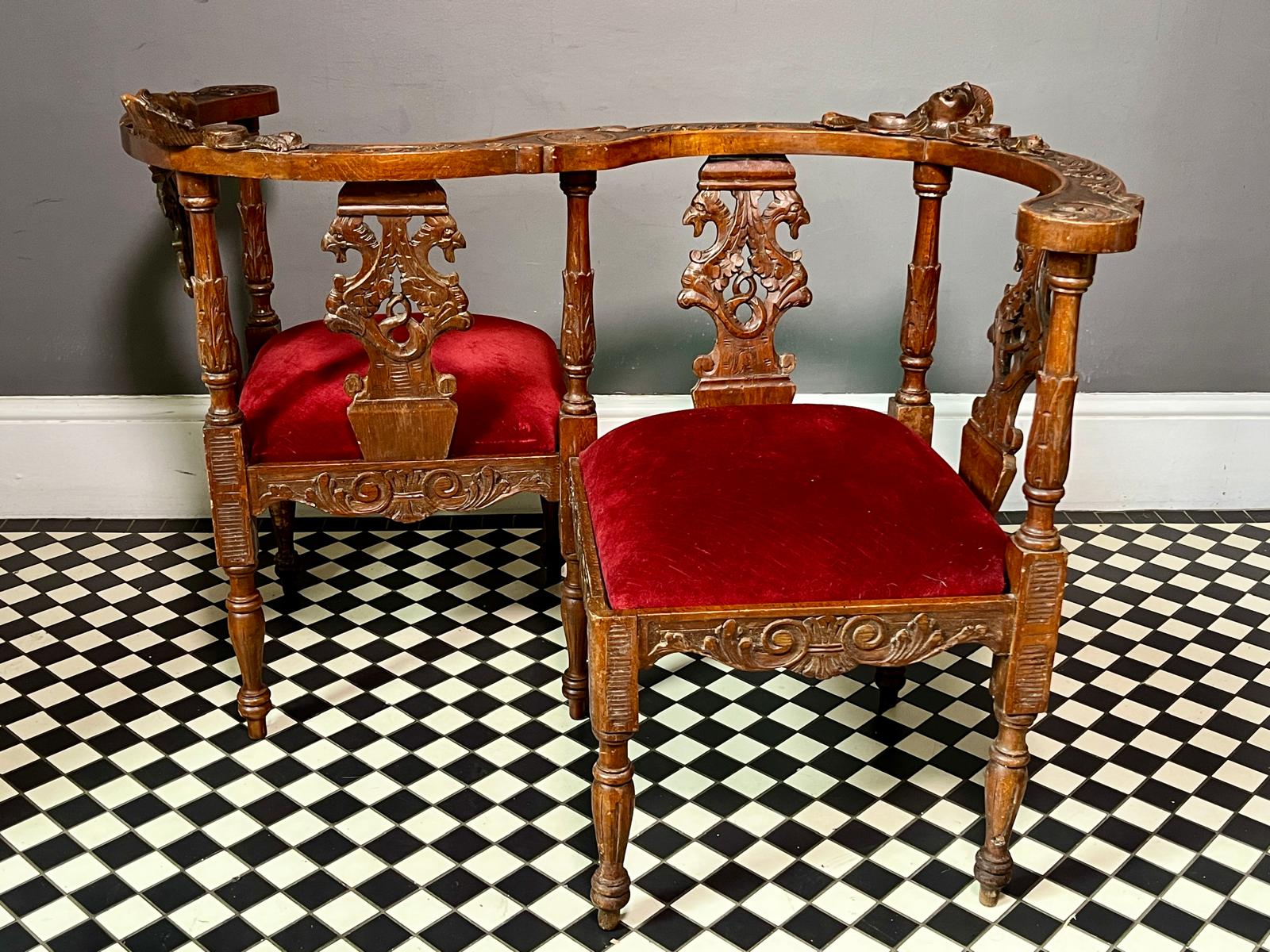 Rich red velvet fabric on the chairs which highlights the intricately carved details.